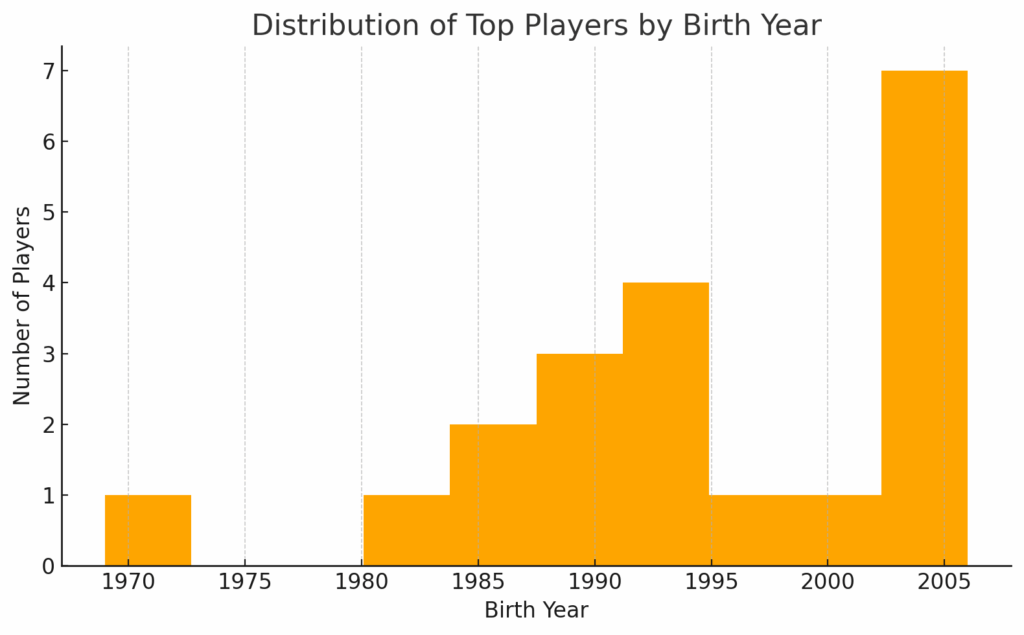 - The average birth year of the top 101 players is around 1995, indicating a youth-driven elite group in modern chess.